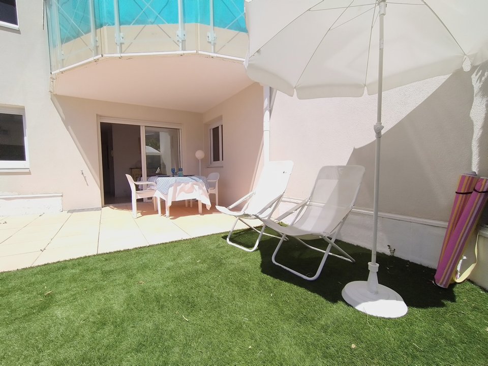 Bel appartement 2 pièces avec terrasse en rez de jardin de 15m2 ,dans résidence à 400m plage, 50m des commerces, exposition Sud, Place de parking privée en sous-sol. (navette des plages gratuite en été)