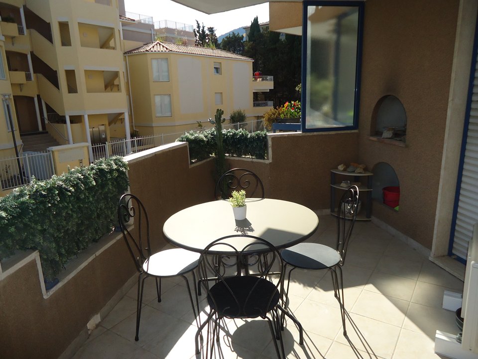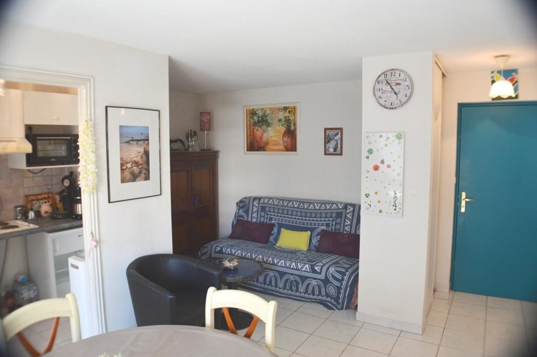 Bel appartement de 2 pièces climatisé (séjour), à 100m des commerces, 1° étage, 40 m2, terrasse équipée, exposition sud-ouest. Garage privé. (navette des plages et village gratuite en été). Composition: Séjour, canapé convertible 2 pers, cuisine équipée avec , plaques electr, four/grill, frigo top, chambre, 1 lit 2 pers, salle de bains (baignoire), WC séparé, TV. Lave-linge.
