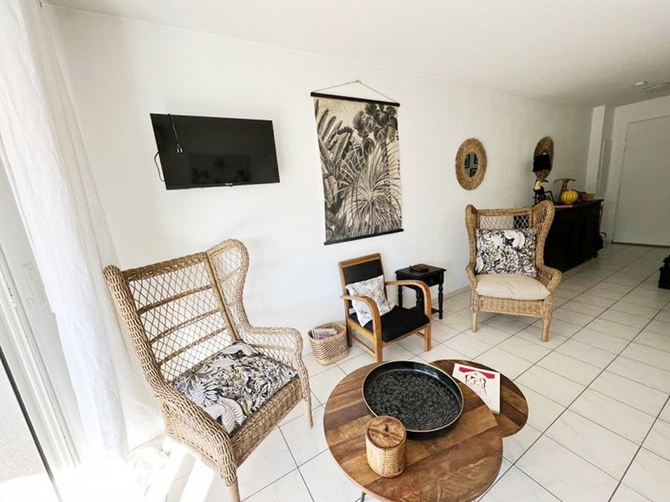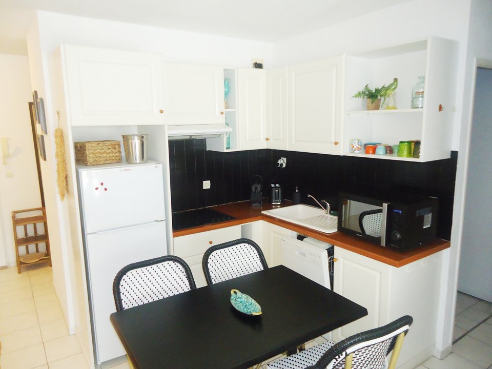 Composition : Séjour climatisé 1 convertible 2 pers TV, espace cuisine équipé avec lave-vaisselle, four micro-ondes combiné, plaque de cuisson, réfrigérateur-congélateur, chambre climatisée 1 lit 2 pers en 140, chambre climatisée 2 lits superposés en 90 et 1 lit tiroir 90, salle de bains (douche) lave-linge, wc séparé. 100m Centre ville - 50m Commerces - 300m Marina - 400m Plages de sable.