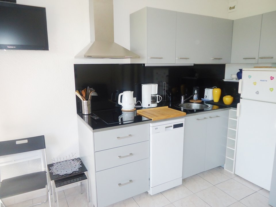 Studio au 1° étage, ascenseur, 20m2 , exposition sud-est, vue mer, terrasse équipée avec mobilier et store banne, 800m de la plage, 700m centre, parking privé. Entrée, 2 lits superposés 1 pers, espace cuisine équipé avec plaques vitro, réfrigérateur-congélateur, four, lave-vaisselle, lave-linge, séjour canapé convertible 2 pers, TV, salle de bains (douche, lavabo), wc.