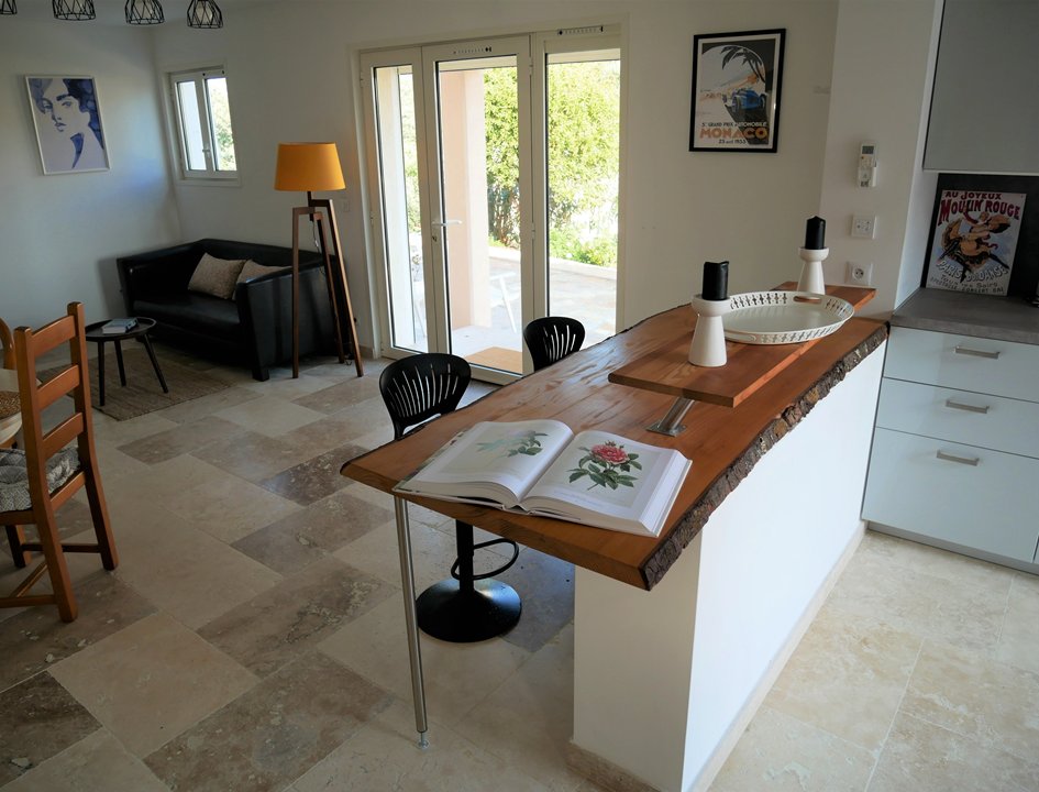 Bel appartement de 3 pièces en rez de jardin de villa, vue mer, quartier calme, parking dans la propriété. WIFI. Composition : séjour : 1 canapé, TV , cuisine américaine équipée : lave vaisselle, four, plaques vitro, micro-ondes, réfrigérateur-congélateur, chambre 1 lit 2 personnes 140, salle de bains : baignoire, douche, lavabo, WC, chambre 1 lit 2 personnes 140, Cellier avec lave-linge.