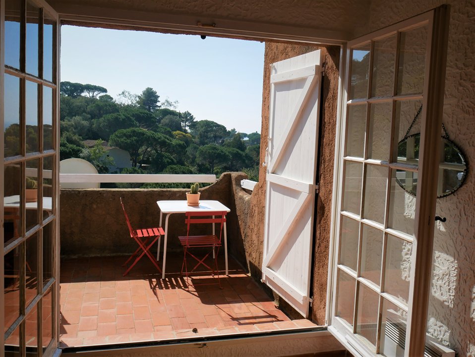 Bel appartement climatisé 2 pièces , vue mer, au 1° et dernier étage dans une résidence sécurisée de style provençal avec PISCINE, calme et résidentielle, exposition Sud, 50 m2, plages de Gigaro à 1500m, Piscine et tennis à 500m