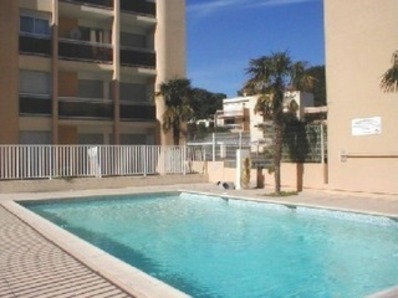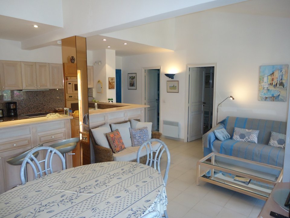 Bel appartement climatisé 2 pièces au 1° et dernier étage dans une résidence sécurisée de style provençal avec PISCINE, calme et résidentielle, exposition Sud-Ouest, 45 m2, plages à 800m (navette des plages gratuite en été) grande terrasse, parking privé ( 2 pl ), tennis à 200m.