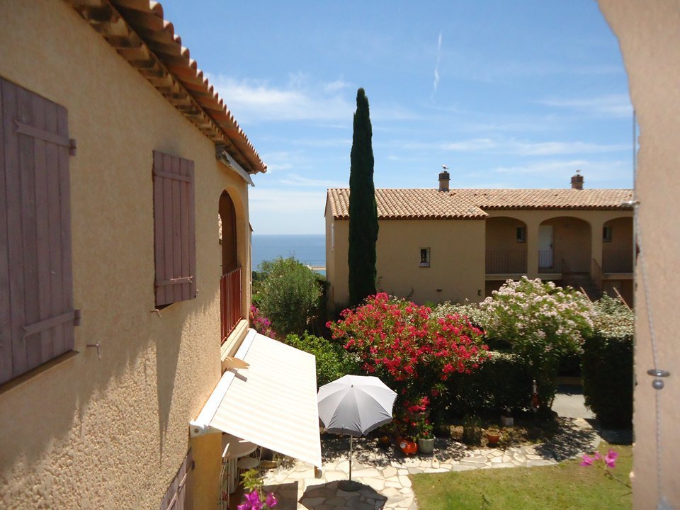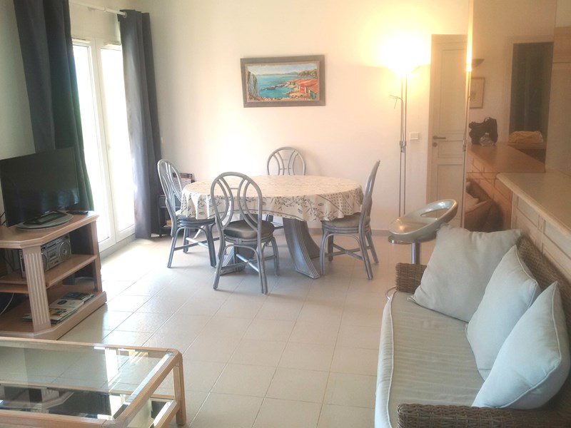 Bel appartement climatisé 2 pièces au 1° et dernier étage dans une résidence sécurisée de style provençal avec PISCINE, calme et résidentielle, exposition Sud-Ouest, 45 m2, plages à 800m (navette des plages gratuite en été) grande terrasse, parking privé ( 2 pl ), tennis à 200m.