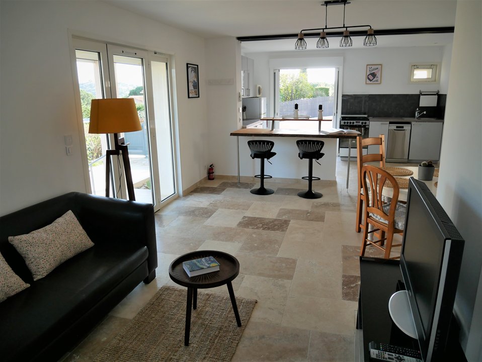 Bel appartement de 3 pièces en rez de jardin de villa, vue mer, quartier calme, parking dans la propriété. WIFI. Composition : séjour : 1 canapé, TV , cuisine américaine équipée : lave vaisselle, four, plaques vitro, micro-ondes, réfrigérateur-congélateur, chambre 1 lit 2 personnes 140, salle de bains : baignoire, douche, lavabo, WC, chambre 1 lit 2 personnes 140, Cellier avec lave-linge.