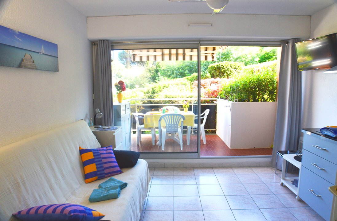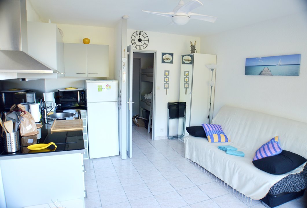 Studio au 1° étage, ascenseur, 20m2 , exposition sud-est, vue mer, terrasse équipée avec mobilier et store banne, 800m de la plage, 700m centre, parking privé. Entrée, 2 lits superposés 1 pers, espace cuisine équipé avec plaques vitro, réfrigérateur-congélateur, four, lave-vaisselle, lave-linge, séjour canapé convertible 2 pers, TV, salle de bains (douche, lavabo), wc.